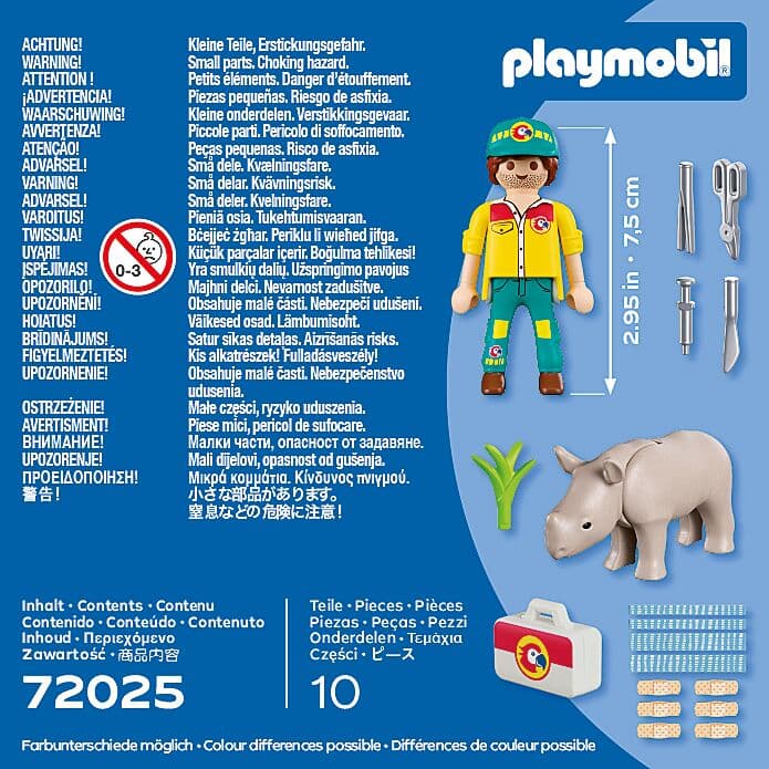 Figuren: 1 Tierpfleger Tiere: 1 Babynashorn Zubehör: 1 Arztkoffer, 1 Arztbesteck-Set, 1 Etikettenbogen mit Pflastern und Verbänden, 1 Pflanzenteil