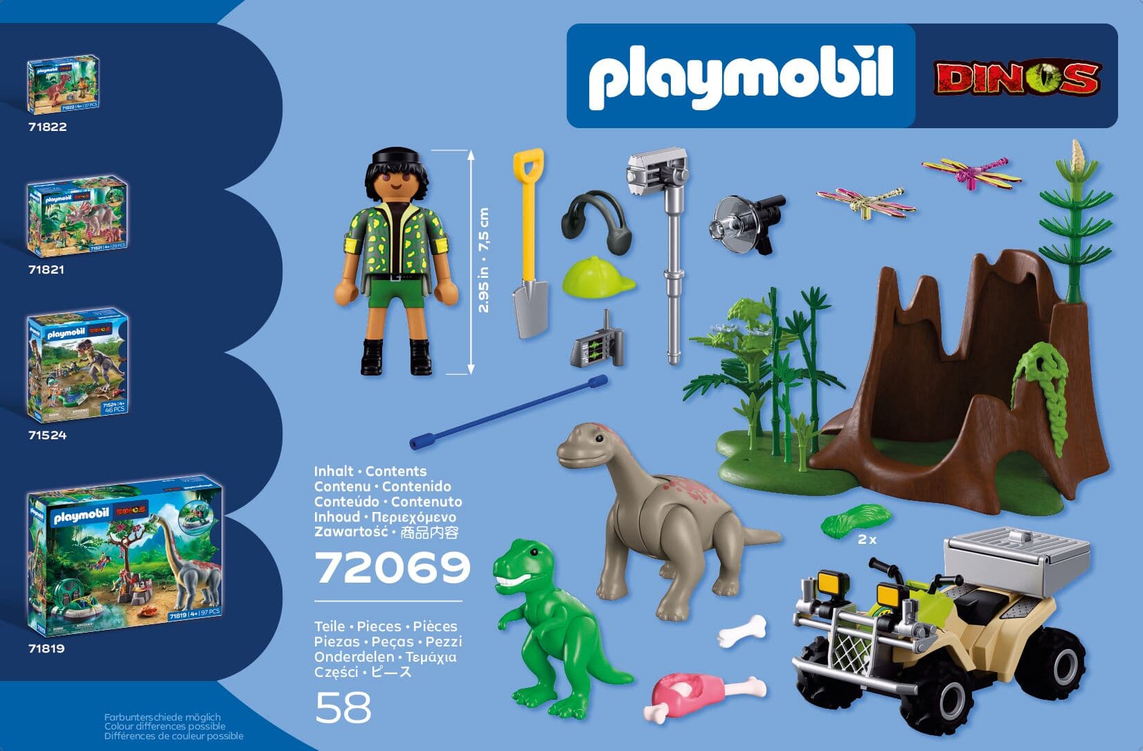 Figuren: 1 Dino-Forscher Zubehör: 1 Helm mit Kopfhörern, 1 Quad mit Rückzugsmotor, 1 Transportbox, 1 Spaten, 1 Richtmikrofon, 1 Kamera, 1 Baumstumpf, 1 Bodenplatte, 8 Astkränze, 5 Bambuspflanzen, 3 Blüten, 1 Flechte hängend, 1 Fleischkeule, 1 Knochen, 2 Grasbündel Tiere: 1 T-Rex-Baby, 1 Brachiosaurus-Baby, 2 Libellen