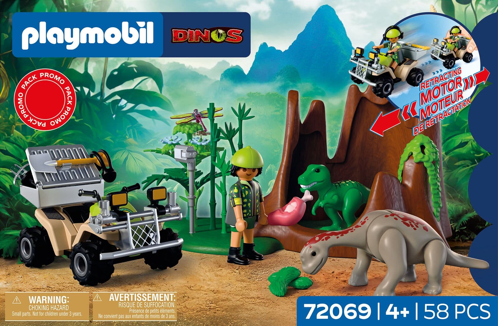 Mit seinem Quad und Forschungs-Equipment ist der Forscher im dichten Dino-Terrain unterwegs, als er plötzlich auf etwas Unglaubliches stößt: Ein T-Rex-Baby und ein Brachiosaurus-Baby – friedlich nebeneinander in einem ausgehöhlten Baumstumpf! Schnell macht er sich an die Arbeit: Während er ihre Laute dokumentiert, versorgt er die beiden mit Fleisch und Pflanzen. Dank Rückzugsmotor ist das Quad jederzeit einsatzbereit.