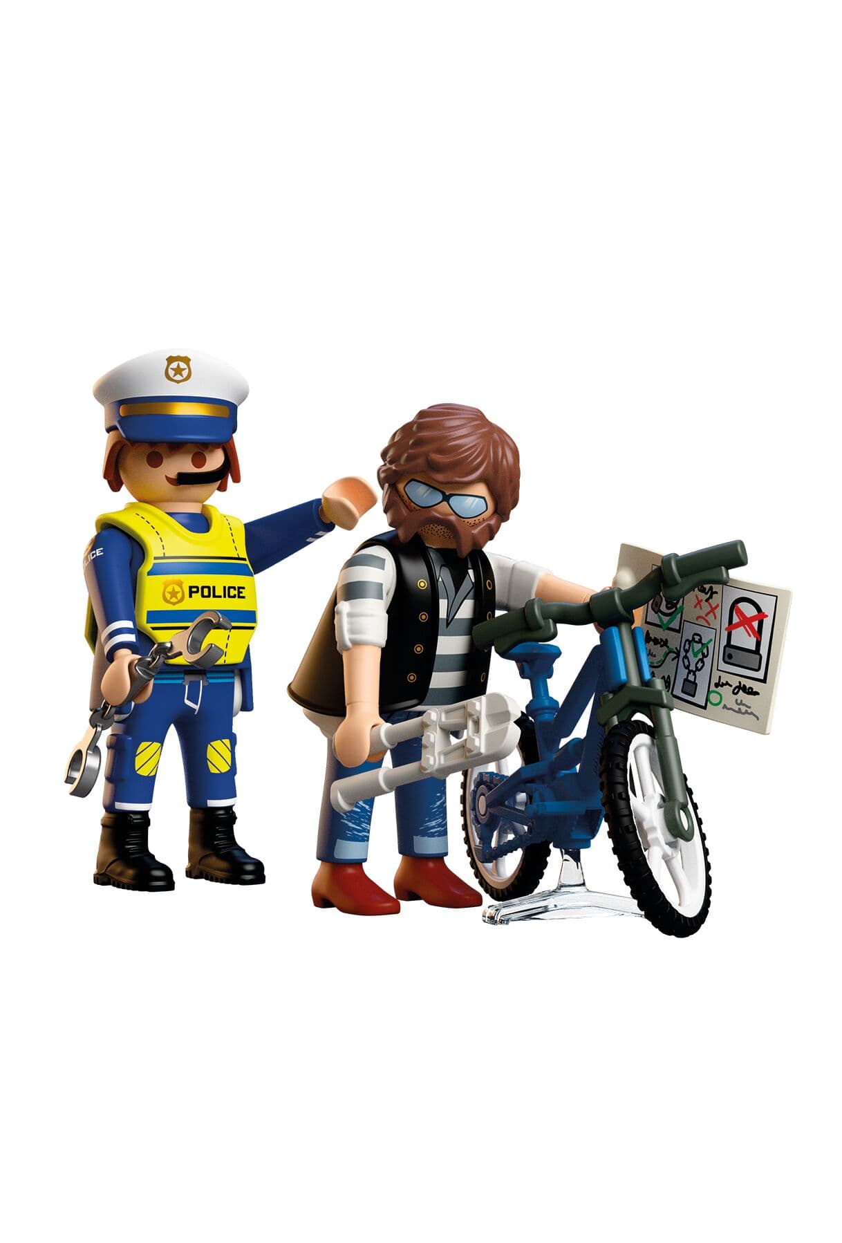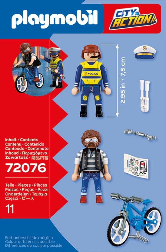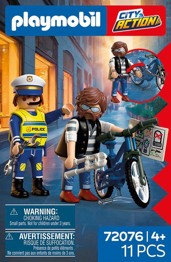 Figuren: 1 Polizist, 1 Ganove Zubehör: 1 Polizeihelm, 1 Fahrrad, 1 Handschellen/Fahrradschloss, 1 Bolzenschneider, 1 Plan