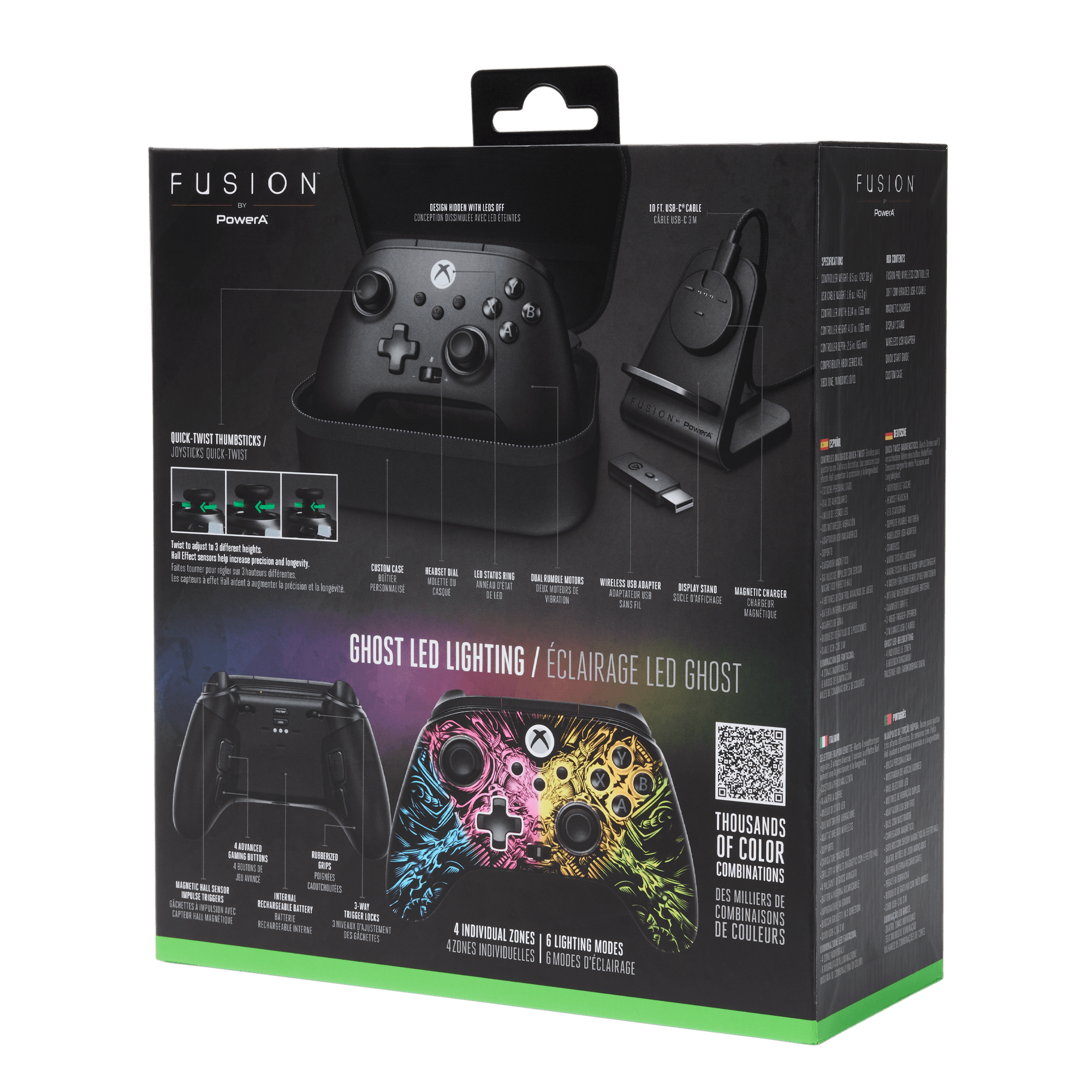 Ghost RGB-LED-Beleuchtung – Der Controller enthüllt ein atemberaubendes verstecktes Design, wenn die RGB-LED-Beleuchtung aktiviert ist, und verfügt über 6 einzigartige Beleuchtungsmodi in 4 anpassbaren Zonen, die die Leistung von FUSION zum Leben erwecken.Quick-Twist-Daumensticks – Mit einer einfachen Drehung kannst du die Höhe für jeden Daumenstick während eines Spiels ganz einfach anpassen.Hall-Effekt-Module — Die berührungslosen Magnetsensoren in den Daumenstäbchen sorgen für ein flüssigeres Pro-Level-Gefühl und sorgen so für Präzision und Langlebigkeit.Kabellos mit niedriger Latenz – Spiele drahtlos auf Xbox Series X|S, Xbox One und Windows 10/11 mit dem mitgelieferten kabellosen USB-Adapter.Taste für erweiterte Spielfunktionen – Verschaffe dir einen Vorteil gegenüber der Konkurrenz mit 4 programmierbaren Tasten, die du während des Spiels im Handumdrehen programmieren kannst .Laden und Präsentieren – Mit dem internen, wiederaufladbaren Akku kannst du bis zu 30 Stunden Spielspaß genießen.* Beinhaltet ein magnetisches Ladegerät mit abnehmbarem, geflochtenem, 3 m langem USB-C-Kabel zum Aufladen des Controllers sowie einen Standfuß, um den Controller bei Nichtgebrauch zu präsentieren.Immersives Gaming – Doppelte Rumble-Motoren und Impulstrigger verleihen deinen Spielen naturgetreue taktile Details, während eine 3,5-mm-Stereobuchse für klaren, dynamischen Klang sorgt.3-Wege-Triggersperren – Stelle die Reichweite der Trigger mit drei verschiedenen Positionen ein, um schnellere Aktionen in deinen Lieblings-FPS-Spielen auszuführen oder in einem schnellen Rennwagen Vollgas zu geben.Offiziell lizenziert — für Xbox Series X|S und funktioniert auf Xbox One und Windows 10/11