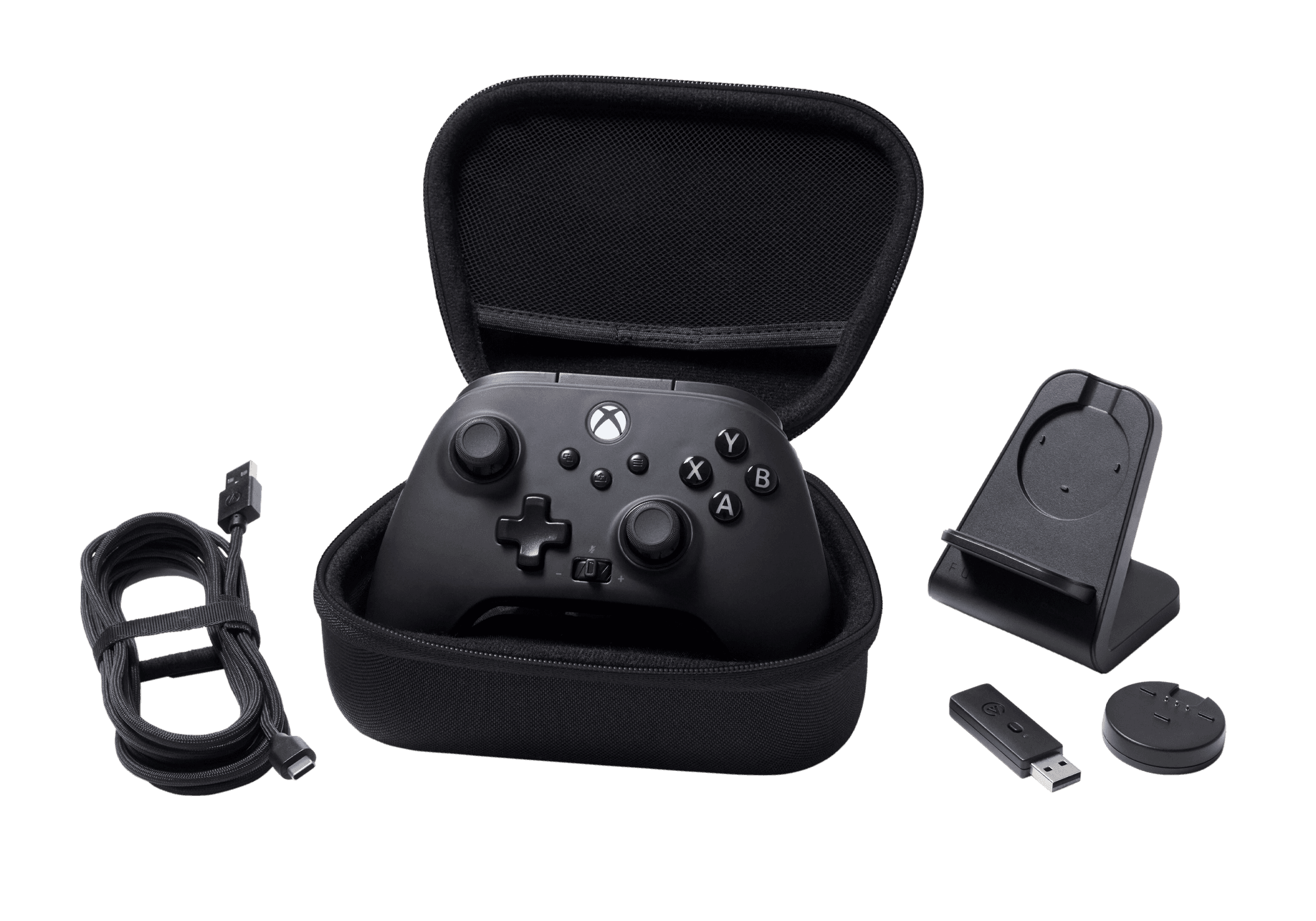 | Lieferumfang | Kabelloser FUSION Pro-Controller 3 m langes, geflochtenes USB-C-Kabel Kabelloser USB-Adapter Magnetisches Ladegerät Standfuß Schutzetui Schnellstart-Anleitung |