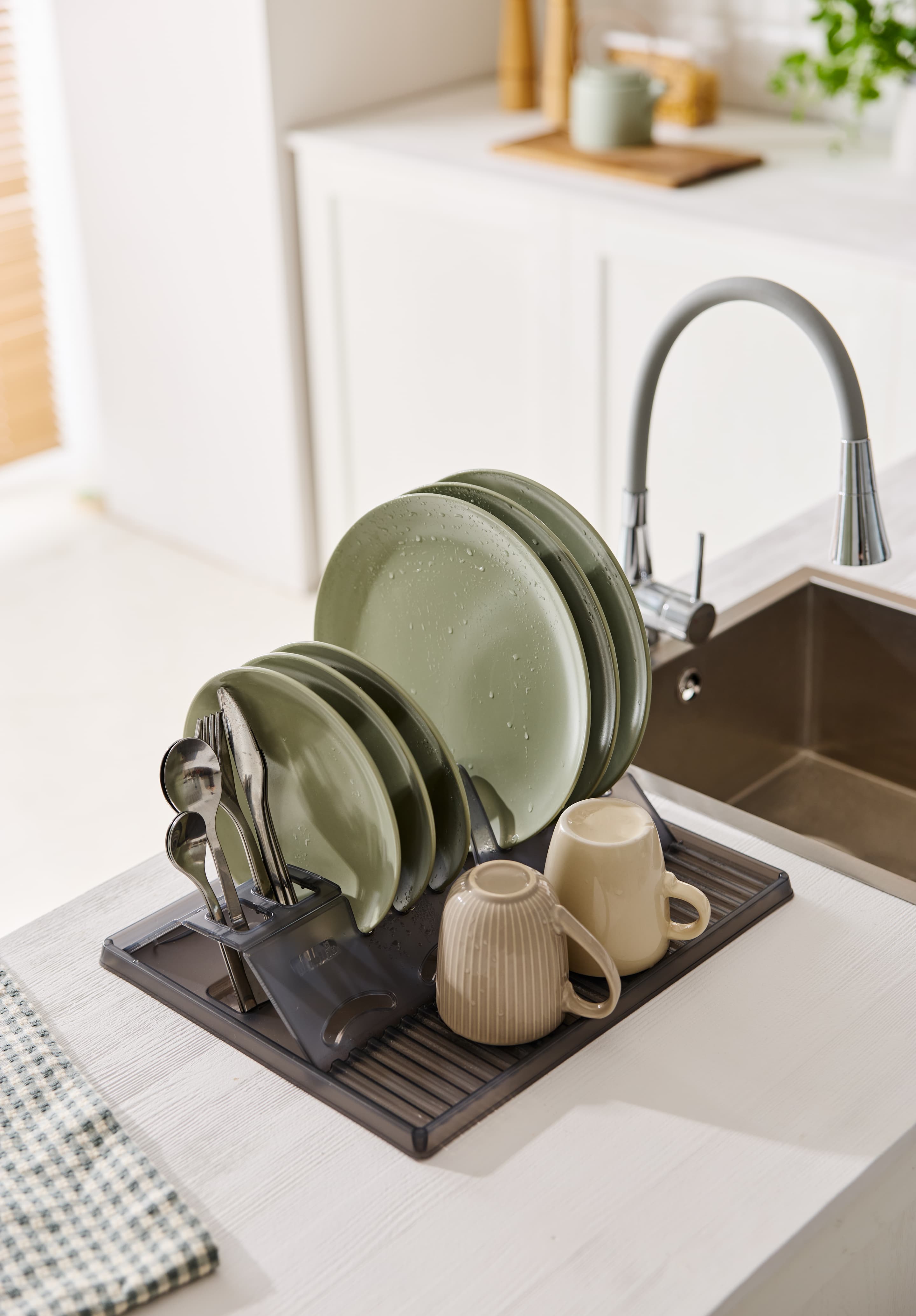 Der durchdachte faltbare Geschirrabtropfer verfügt über verschiedene Vorteile. Er ist sehr einfach aufzubauen und gewährleistet ideales Trocknen, da unterschiedlichstes Geschirr wie Teller, Besteck, Becher und Weingläser in den dafür vorgesehenen Aussparungen platziert werden kann. Der faltbare Geschirrabtropfer optimiert den Platz in der Küche, da man ihn platzsparend zusammenfalten und in einer Schublade verstauen kann.