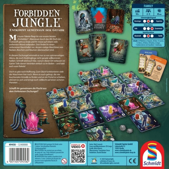 Taucht ein in ein packendes Sci-Fi-Abenteuer mit Forbidden Jungle™ von Schmidt Spiele! Nach einer Notlandung auf einem fremden Mond entdeckt ihr einen überwucherten Raumhafen voller rostiger Maschinen und gefährlicher Kreaturen. Eure Mission: Findet gemeinsam vier leuchtende Kristalle und aktiviert das Portal, um dem versinkenden Dschungel zu entkommen!