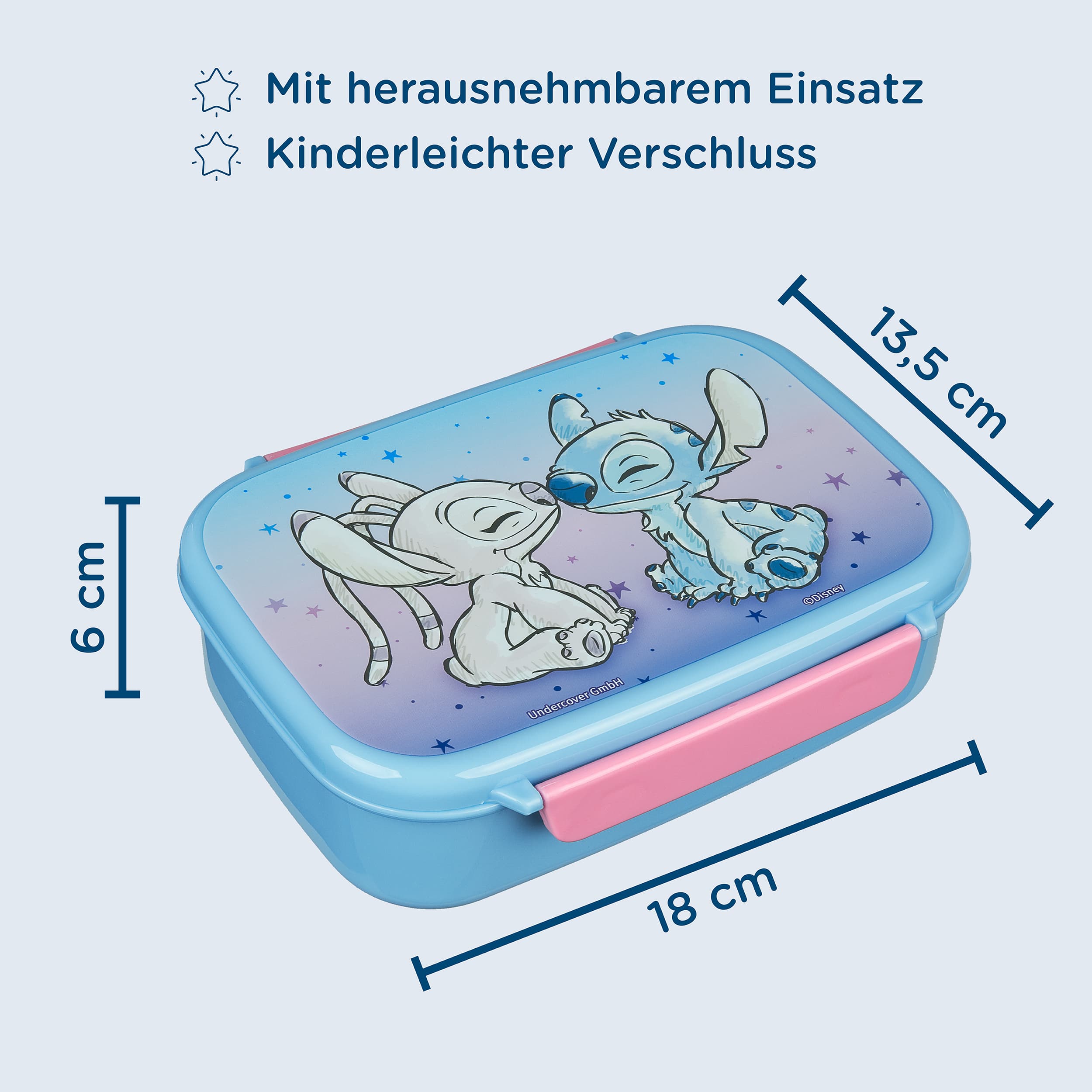 Die Scooli Brotdose Stitch für Kinder eignet sich ideal als Brotdose für Kindergarten und Schule. Die Brotdose mit Unterteilung und herausnehmbarem Einsatz, lässt sich perfekt für ein ausgewogenes Frühstück verwenden. Die Stitch Brotdose lässt sich durch 2 Klickverschlüsse kinderleicht öffnen und schließen. Das niedliche Design mit Stich und Angel ist besonders für Mädchen ein idealer Begleiter für Vorschule und Schule.