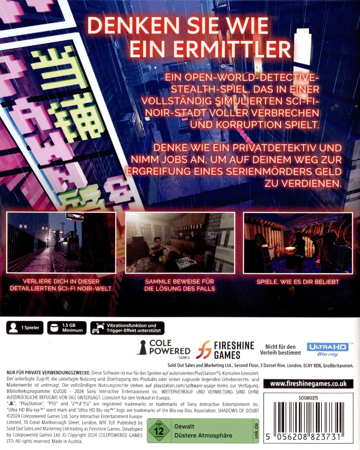 Ein Open-World-Stealth-Spiel mit einer ganzen Stadt voller Geheimnisse, die Sie nur mit Ihren Fingerspitzen berühren müssen!Shadows of Doubt spielt in einer alternativen Realität der hyperindustrialisierten 1980er Jahre, in der die Regierung die Polizeiarbeit an private Unternehmen und Auftragnehmer auslagert. Sie sind ein privater Ermittler, der sein Geld damit verdient, Informationen zu finden und zu verkaufen.