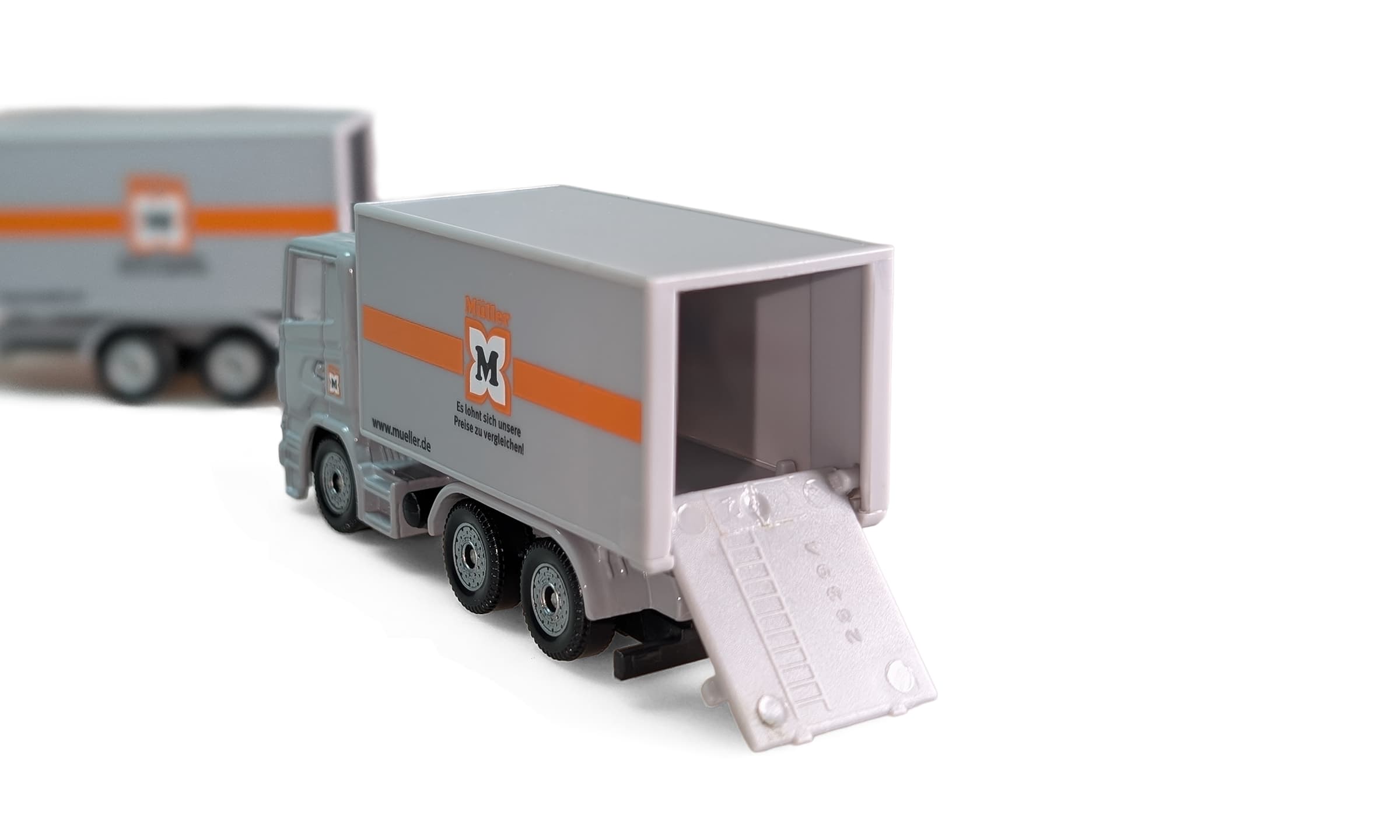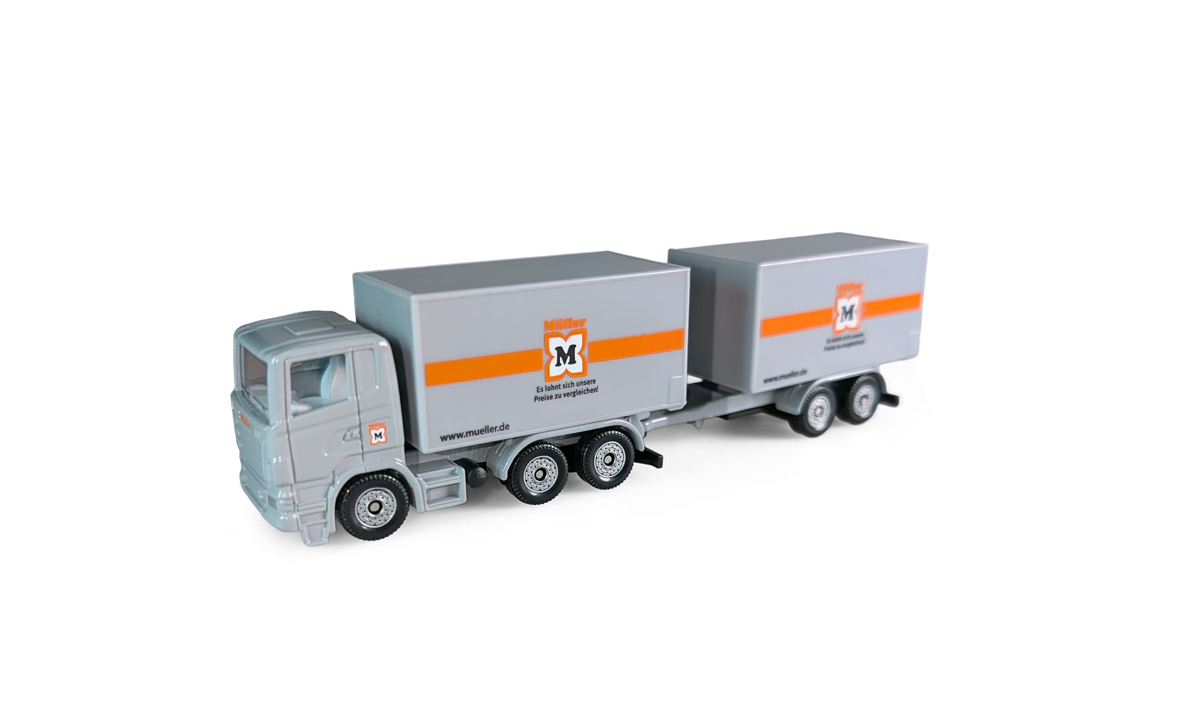 Mit der Zugmaschine mit Anhänger im exclusiven Müller Design werden die vielen Produkte aus dem Lager in Ulm in die Müller Filialen geliefert, damit diese am nächsten Tag wieder für unsere Kunden bereitstehen. Die Heckklappen der Box-Aufbauten der Zugmaschine und des Anhängers lassen sich öffnen, zudem kann der Anhänger an- und abgekuppelt werden.