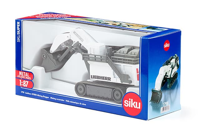 Der Mining-Riese. Der Gigant unter den Raupen-Baggern auf Baustellen und im Tagebau ist selbst im HO-Maßstab ein wahrer Koloss. Die topaktuelle R9800 Baureihe von Liebherr zählt zu den größten und stärksten Baggern weltweit. Das fast komplett aus Metall gefertigte Modell wird durch zwei breite Raupenketten sicher zum nächsten Einsatzort transportiert. Der riesige Hochlöffel-Baggerarm mit Klappschaufel ist voll funktionsfähig und belädt den Mining-Kipper in kürzester Zeit. Die Fahrerkabine und die Aufstiegsleitern sind präzise herausgearbeitet und vervollständigen dieses außergewöhnliche Modell.Produktmaße in mm: 284x107x113