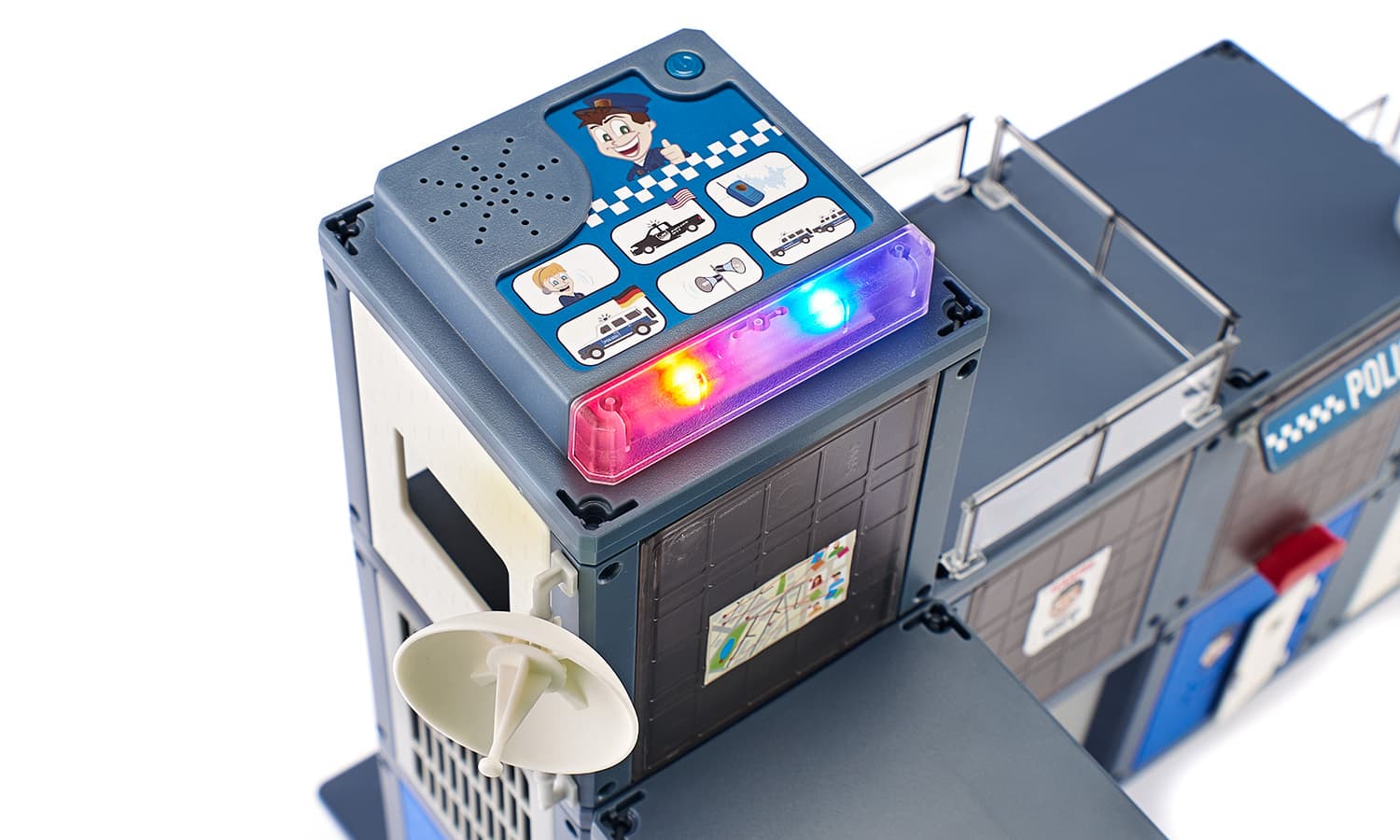 Auf zur GangsterjagdCrimetime in der SIKUWORLD: Gefängnisausbruch. Die Gangster haben mit einem an einem Dodge RAM 1500 befestigten Seil eine Wand herausgerissen und dem Komplizen zur Flucht verholfen. Der Gefängnishof ist hell erleuchtet. Die Polizei rückt mit einem Mercedes-Benz Sprinter mit Kofferaufbau an, die Beamten liefern sich einen Schusswechsel mit den Gangstern und treffen den großen Pick-up in den Seitentüren. Dennoch gelingt es den Gangstern, zu fliehen. Mit dem Light&Sound Modul entsteht eine filmreife Szenerie in der SIKUWORLD. Mit der neuen Polizeistation wächst die SIKUWORLD weiter. Das dreigeschossige Gebäude kann nach der anschaulich bebilderten Anleitung zusammengesteckt werden. Aus den Bauelementen entstehen auch ganz individuelle Gebäude in L- oder U-Form oder wachsen zu einem mehrgeschossigen Gebäude empor. Der modulare Aufbau und die Stabilität des Stecksystems setzen der Kreativität der Kinder keine Grenzen. Das siku Stecksystem fördert dabei spielerisch die motorischen und kognitiven Fähigkeiten des Kindes. Die Möglichkeit, ohne Hilfe von Erwachsenen etwas zu erschaffen, stärkt zudem das Selbstbewusstsein.Die SIKUWORLD Polizeistation ist kompatibel mit den anderen Sets der SIKUWORLD, ist aber auch allein bespielbar. Enthalten sind Bauelemente wie Wände mit Gitterfenstern für die Aufenthalts- und Diensträume der Polizei und für den Zellentrakt. Das dreigeschossige Gebäude mit einer Dachterrasse ist in der siku-typischen Weise mit Antenne, Falltür, Leitern, einem nachleuchtenden Suchscheinwerfer, Satellitenanlage, Tisch und Stühlen und einer Überwachungskamera detailliert ausgestattet. Natürlich lässt sich die Fahrzeugflotte mit den vielen siku Polizeifahrzeugen vergrößern.Produktmaße in mm: 419x239x285