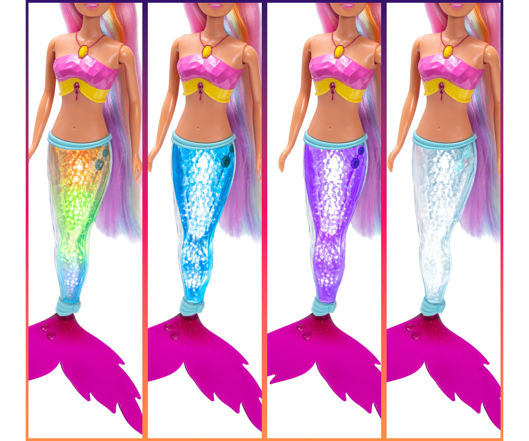 • Regenbogenlicht in der Flosse – Die Schwanzflosse der Meerjungfrau leuchtet auf Knopfdruck in verschiedenen Farben und bietet als Highlight ein faszinierendes Farbspiel mit Regenbogeneffekt.