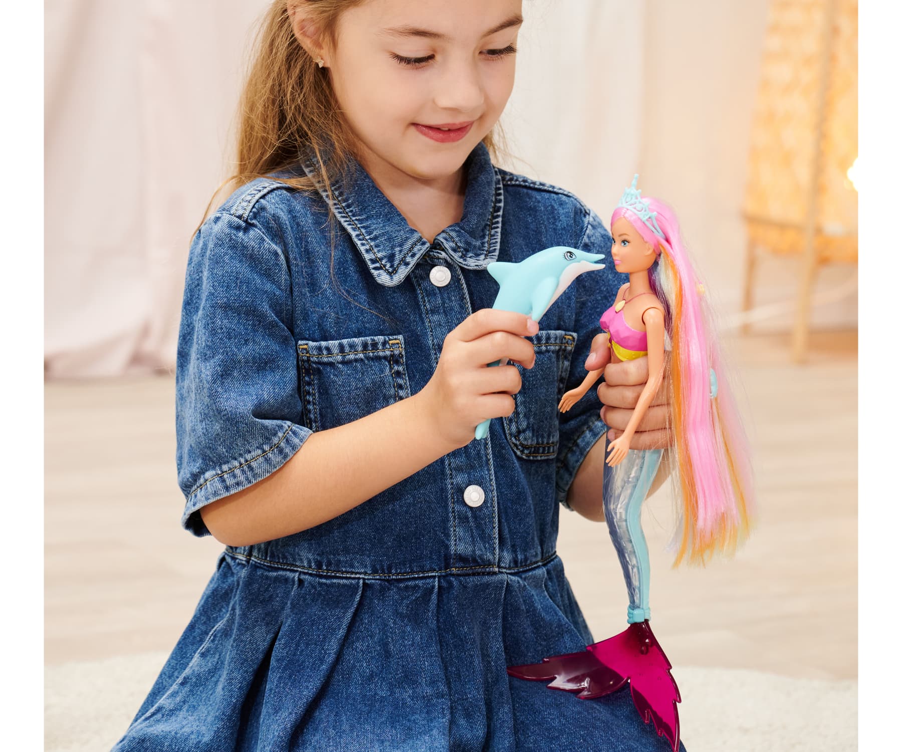 • Zauberhafte Meerjungfrau – Steffi LOVE begeistert als Meerjungfrau mit leuchtender Flosse und Delfinfreund als tierischen Begleiter für magischen Unterwasser-Spielspaß