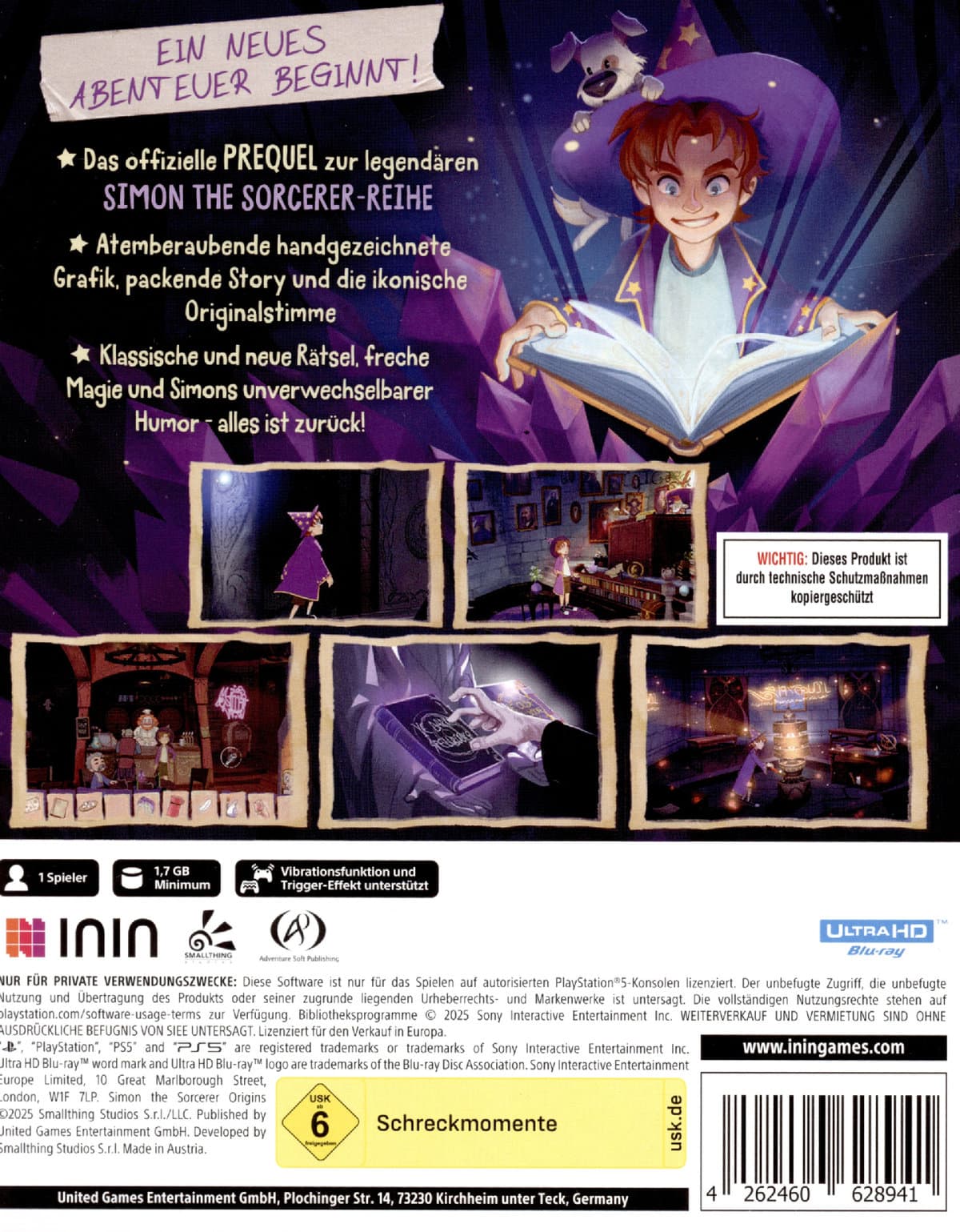 EIN NEUES ABENTEUER BEGINNT Erlebe die magische Welt wie nie zuvor in Simon the Sorcerer Origins, dem heiß erwarteten Prequel zur kultigen Point-and-Click-Adventure-Serie. In diesem neuen Abenteuer kehrt Simon, der sarkastische Zauberer der Videospielgeschichte, zurück, um Geheimnisse und Geschichten aus seiner Vergangenheit zu enthüllen! Ob du die magische Welt zum ersten Mal betrittst oder zurückkehrst - Simon ist zurück, mit seinem einzigartigen Humor und einem komplett neuen Grafikstil. Simon the Sorcherer Origins bringt den Charme der Original-Saga zurück in einem komplett handgezeichneten Stil und kombiniert klassische Spielmechaniken mit einer frischen, neuen Welt voller Magie. Löse zahlreiche knifflige Rätsel, stelle deinen Verstand auf die Probe und begegne einer Vielzahl absurder Situationen und skurriler Charaktere. Kombiniere Gegenstände und Hinweise, um das große Geheimnis zu lüften und der legendäre Zauberer zu werden, der in dir steckt. Finde heraus, was Simon kurz vor seinem ersten magischen Fehltritt in die Fantasywelt erlebt hat. Lange bevor er anfing, sprechende Türen zu beleidigen. Dreißig Jahre nach seinem ersten Bildschirmauftritt wird Simon durch eine uralte Prophezeiung in eine fremde Welt gezogen - eine Welt, die seine Herkunft offenbart. Diese ist bevölkert von mächtigen, aber meist nutzlosen Zauberern und seltsamen Kreaturen. Auf seiner Reise muss Simon eine Reihe kniffliger Rätsel lösen, alchemistische Geräte bedienen und mächtige Zaubersprüche erlernen. Und ja, er muss auch ein paar widerliche Eintöpfe probieren! Handgezeichneter Grafikstil und Originalstimme Dank liebevoll gezeichneter Grafik und Chris Barrie (Englisch) / Erik Borner (Deutsch) als Simons original Stimme fühlt es sich an wie eine Zeitreise in die 90er, nur eben mit besserer Auflösung. Zwischen Zauberformel und Zahnrad Klassisches Point-and-Click trifft auf moderne Mechaniken. Löse schräge Rätsel, knacke uralte Mechanismen und sammle (wie immer) viel zu viele Gegenstände ein. Sarkasmus, Slapstick und schrullige Zauberer Triff auf skurrile Gestalten, noch skurrilere Dialoge und genieße Simons unverwechselbaren Witz. Irgendwo zwischen rotzfrech und "very britisch". Alchemie, Magie und andere Missgeschicke Experimentiere mit Zaubersprüchen, alchemistischen Gerätschaften und fragwürdigen Rezepten. Mit etwas Glück passiert sogar das, was du wolltest.
