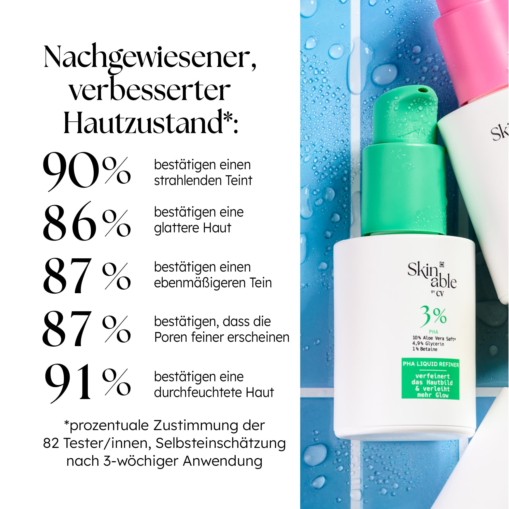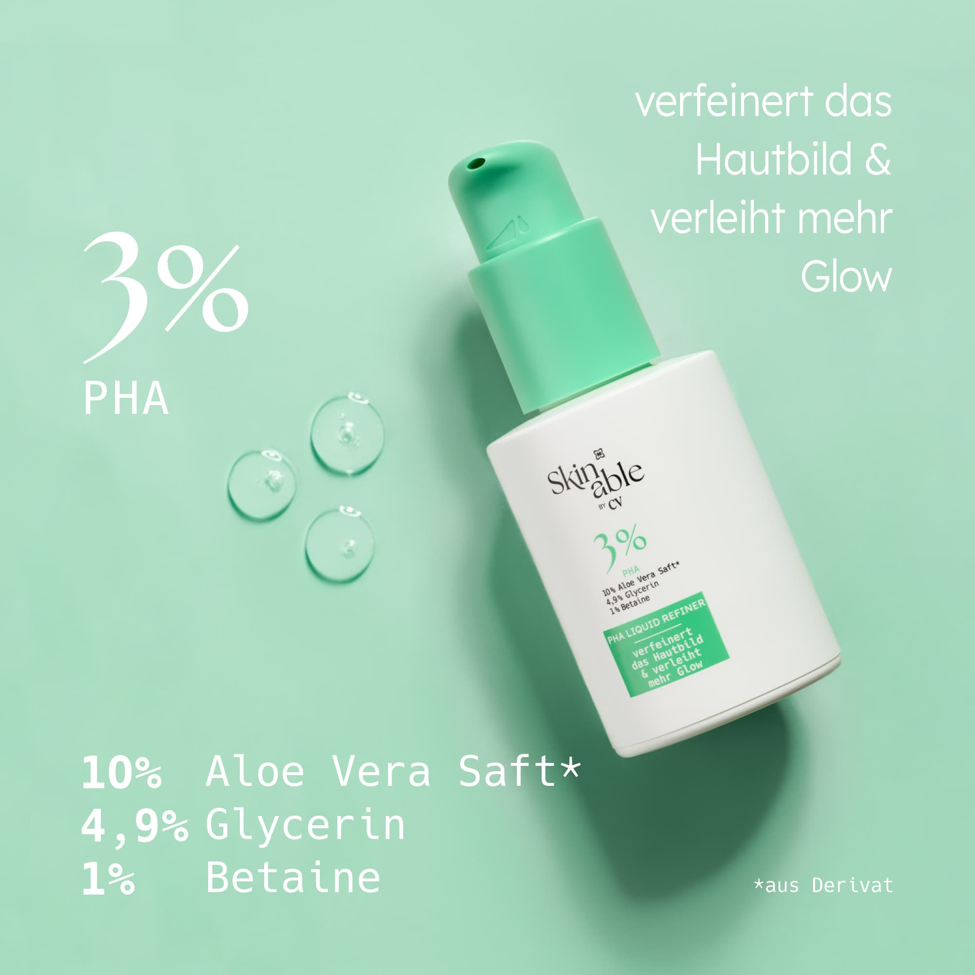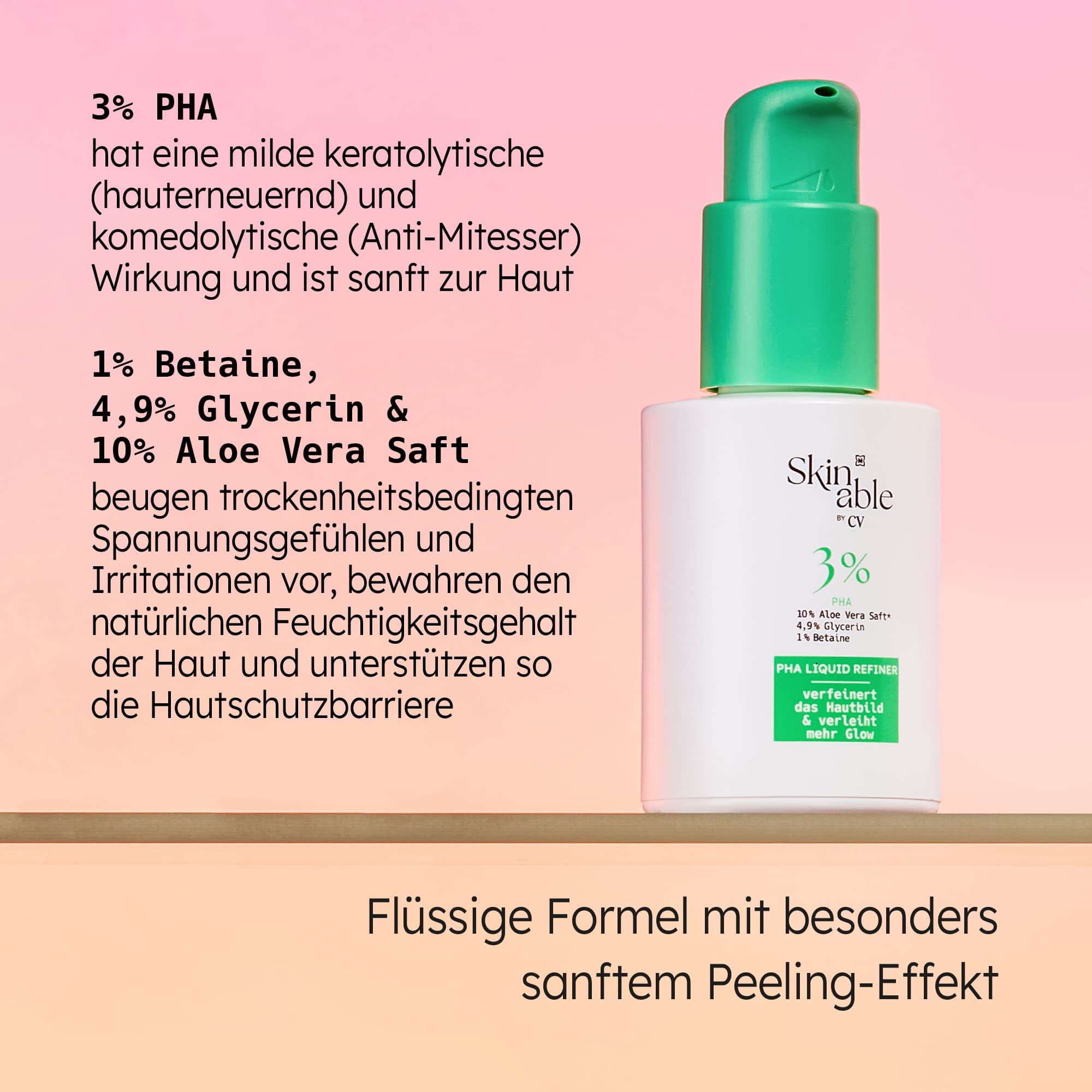Der SKINABLE PHA Liquid Refiner kombiniert die pflegenden Eigenschaften eines Gesichtswassers mit der hautverfeinernden Wirkung eines chemischen Peelings. Verfeinert die Poren und lässt den Teint ebenmäßiger erscheinen**. Die klärenden Eigenschaften durchfeuchten die Haut und bereiten sie optimal auf die Gesichtspflege vor.