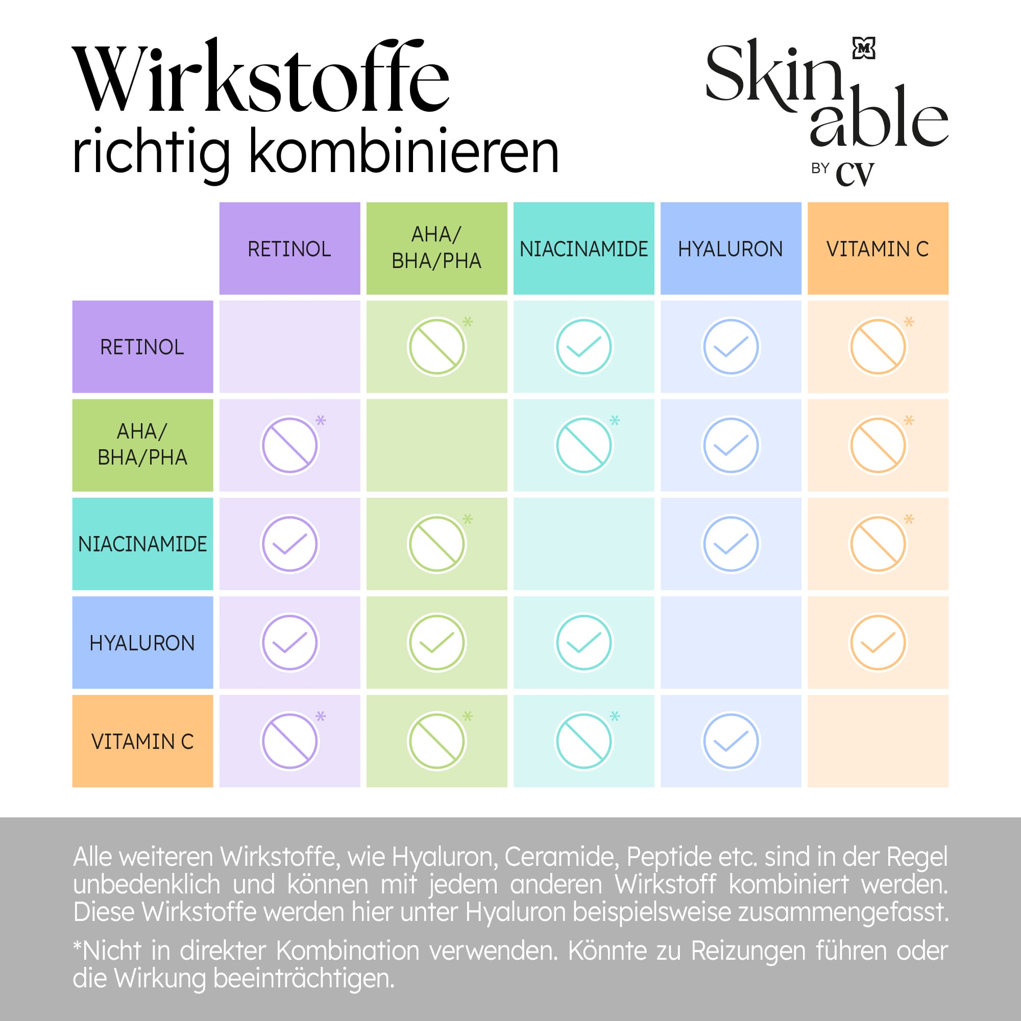 In Kombination keine Produkte mit AHA, BHA oder Niacinamid verwenden. Nicht mit Augen oder Schleimhäuten in Berührung kommen. Nur zur äußerlichen Anwendung. Direkte UV-Strahlung (Sonne, Sonnenbank) vermeiden und eine Pflege mit Lichtschutz (mind. LSF 30) verwenden. Sollten Hautirritationen auftreten, verwenden Sie das Produkt nicht weiter und wenden Sie sich an einen Arzt. Nicht in der Reichweite von Kindern aufbewahren. In Schwangerschaft und Stillzeit vor Gebrauch einen Arzt befragen. Nicht bei sensibler Haut verwenden.