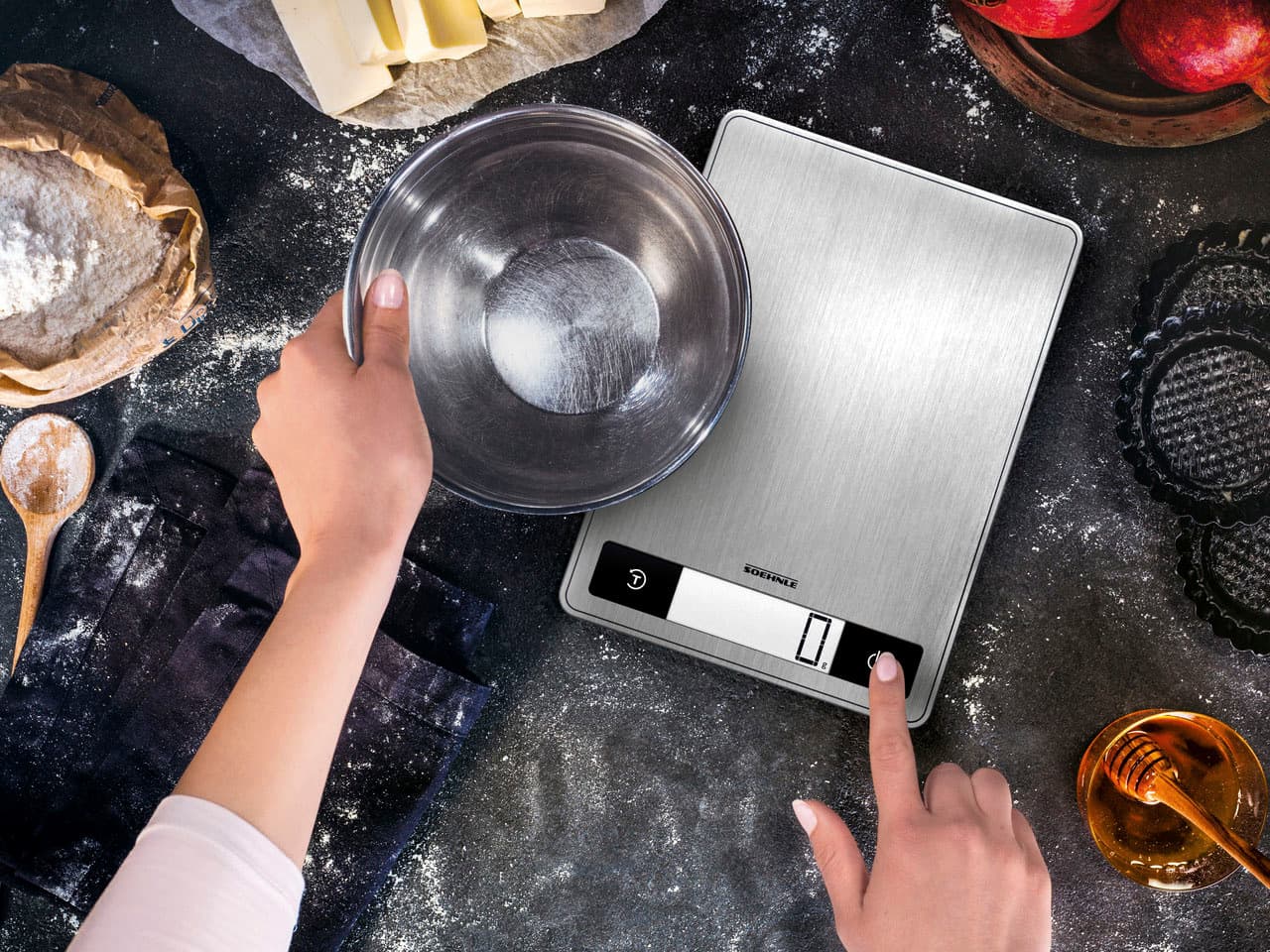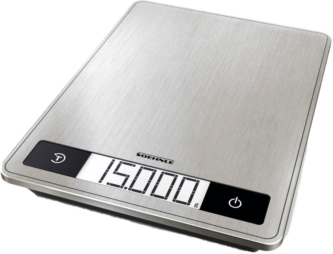 Mit dieser Küchenwaage ist bereits die Zubereitung ein Genuss: Die Page Profi 200 von SOEHNLE bringt mit ihrer extraflachen Wiegefläche aus hochwertigem Edelstahl einen edlen Designlook in die Küche, das i-Tüpfelchen in jedem modernen Küchenambiente. Die spezielle Anti-Fingerprint-Beschichtung lässt die Edelstahl-Küchenwaage nicht nur länger sauber und schön aussehen, sondern sorgt auch für eine kinderleichte Reinigung der Wiegefläche. Neben ihrer Optik überzeugt sie ebenso mit ihrer Multifunktionalität. Schnell einsatzbereit zeigt sie das Gewicht bis 15 kg auf der beleuchteten LCD-Anzeige sehr gut lesbar an - auch bei schwierigen Lichtverhältnissen. Ihre extragroße Wiegefläche eignet sich selbst für große Töpfe oder große Schüsseln mit vielen Zutaten. Und dank der praktischen Tara-Funktion lässt sich jede Zutat in präzisen 1-g-Schritten dazu wiegen. Bedient wird die Page Profi 200 über zwei patentierte Sensor-Touch-Felder, die nahtlos in der Glaswiegefläche integriert sind und bereits auf sanftes Berühren reagieren. Aufbewahren lässt sich die digitale Küchenwaage ausgesprochen platzsparend zwischen Kochbüchern, in der Schublade oder aufgehängt an der Wand - dort ist die Waage ein edler Blickfang und jederzeit griffbereit. Das Ausschalten der Waage erfolgt automatisch. So lässt sich viel Energie sparen, und die mitgelieferten Batterien halten selbst bei zweimal täglicher Benutzung rund zwei Jahre.- Maße (HxLxB): 3,5 x 22 x 27,5 cm- Material: Edelstahl, Kunststoff