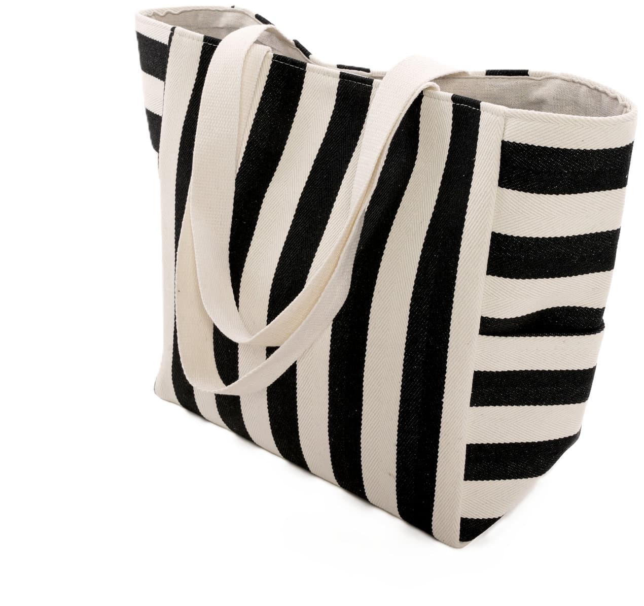 Diese zeitlose Strandtasche in klassischem Schwarz-Weiß-Streifenlook ist der perfekte Begleiter für sonnige Tage. Sie bietet ausreichend Platz für Handtuch, Sonnencreme und alles, was man am Strand braucht. Dank praktischem Druckknopf lässt sich die Tasche sicher verschließen. Leicht, stilvoll und vielseitig – ideal für Strand, Pool oder Sommerausflüge.