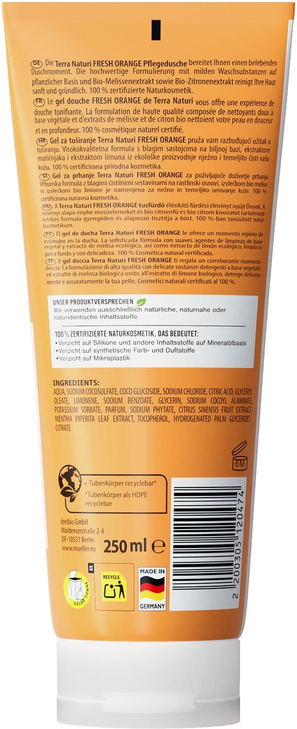 Die Terra Naturi Fresh Orange Pflegedusche sorgt für ein belebendes Gefühl unter der Dusche. Die Formulierung reinigt die Haut sanft und hinterlässt einen angenehmen Duft.
