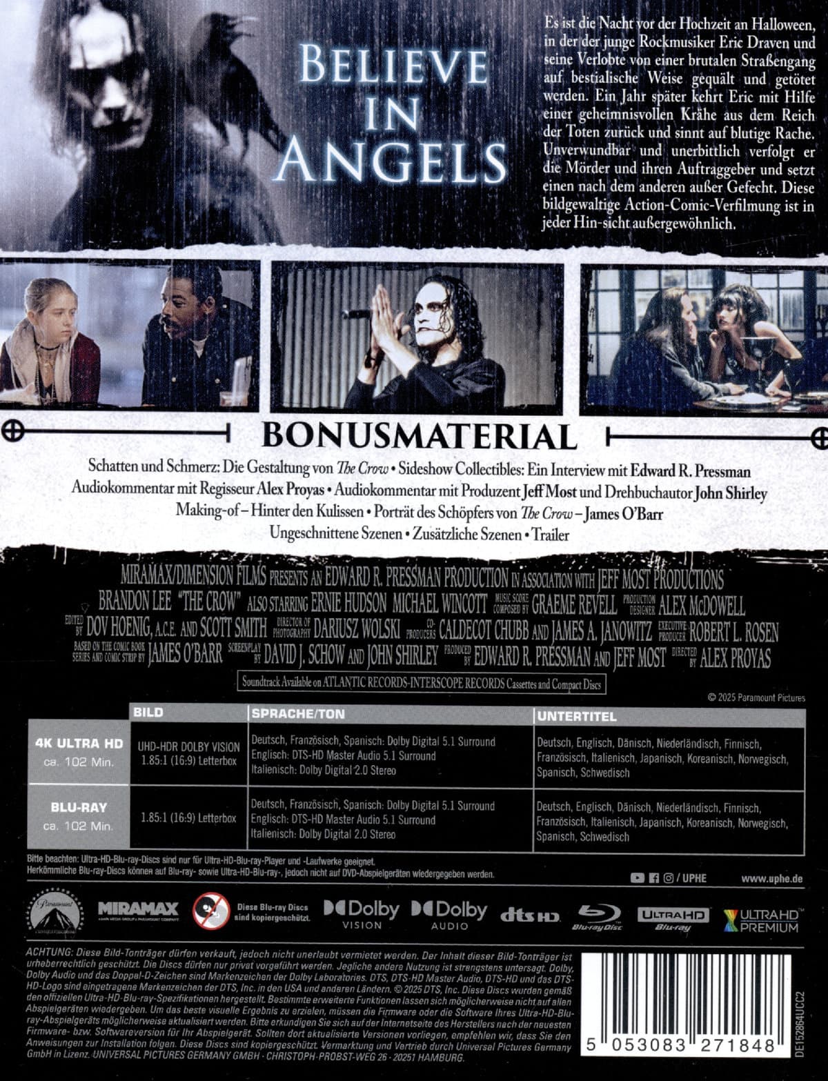 | Zusatzinfos / Bonusmaterial beim Film dabei | - Schatten und Schmerz: Die Gestaltung von "The Crow" - Sideshow Collectibles: Ein Interview mit Edward R. Pressman - Audiokommentar mit Regisseur Alex Proyas - Audiokommentar mit Produzent Jeff Most und DrehbuchautorJohn Shirley - Making of – Hinter den Kulissen - Porträt des Schöpfers von "The Crow" – James O’Barr - Ungeschnittene Szenen - Zusätzliche Szenen - Trailer |