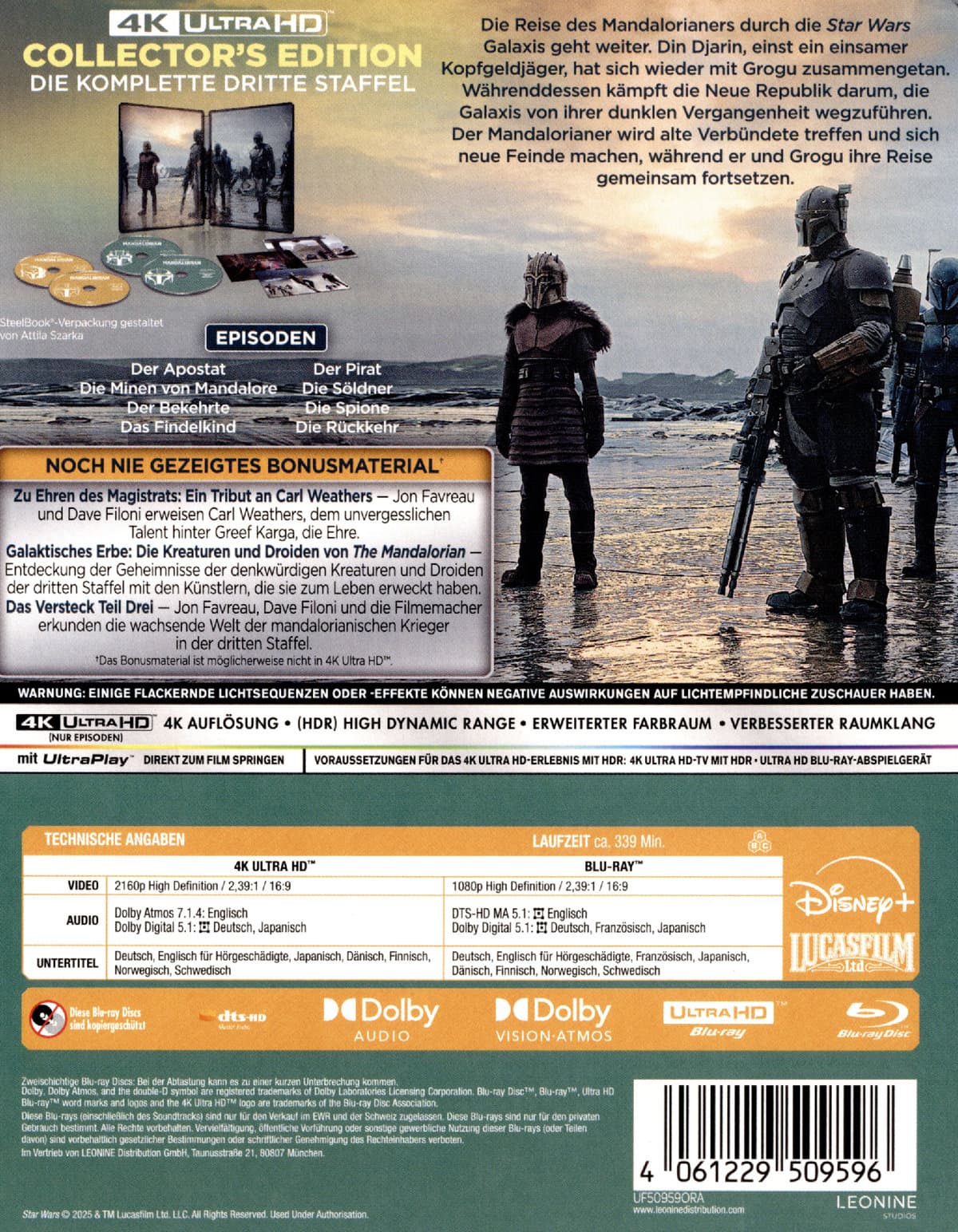 | Zusatzinfos / Bonusmaterial beim Film dabei | Das Versteck Teil Drei, Zu Ehren des Magistrats: Ein Tribut an Carl Weathers, Galaktisches Erbe: Die Kreaturen und Droiden von The Mandalorian |