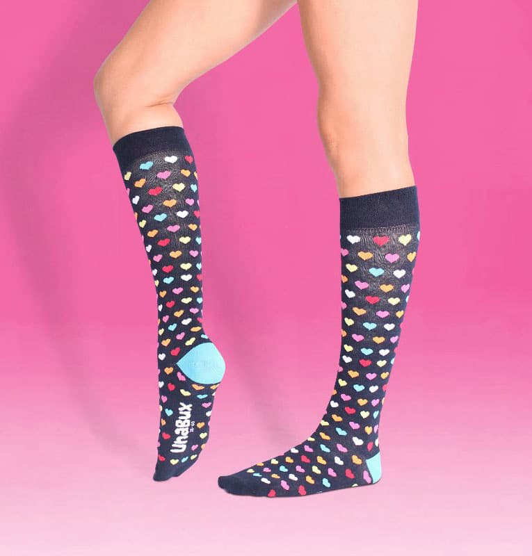Kniestrümpfe mit Herzen für Sie und Ihn. Das Koblenzer Unternehmen Unabux hat sich auf Socken und Unterwäsche mit abwechslungsreichen Mustern und ansehnlichen Kombinationen spezialisiert. Das Motto der beiden Gründer lautet „Alles fresh untenrum“ und genau das nimmt sich das Unternehmen auch zu Herzen. Mit viel Farbe, modernen Designs und einer Menge Charme bringen Unabux Socken Abwechslung in den Schrank. Bei der Herstellung der Produkte legt das Unternehmen besonders hohen Wert auf qualitativ hochwertige Stoffe und Verarbeitung.