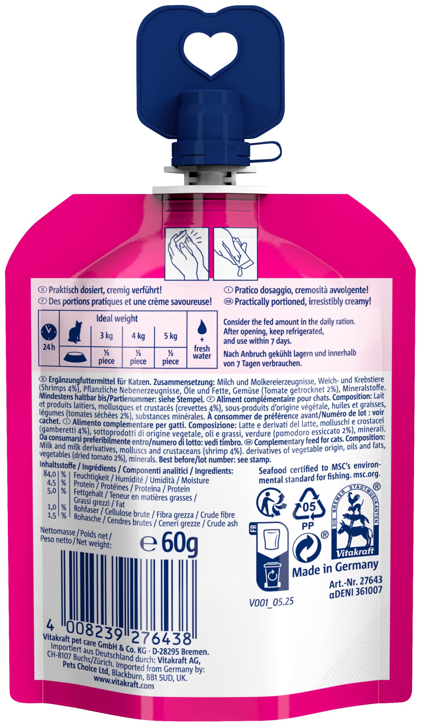 Einfach doppelt verwöhnt. Fancy Fusion: Mehr als cremig. Vitakraft® Licks & Bits macht jeden Snackmoment zum Verwöhn-Ritual. Die köstliche Creme im handlichen Quetschie lässt sich direkt aus der Hand füttern und fördert so ganz natürlich die Nähe zu deiner Katze. Die doppelte Textur – eine Verbindung aus samtiger Basis und zarten Stückchen – spricht selbst die wählerischsten Katzen an und sorgt für unvergleichliche Verwöhnmomente. Ob als kleiner Verwöhnsnack zwischendurch oder als besonderer Meal Topper, Licks & Bits bereichert deine Fütter-Routine genau dort, wo das Besondere gefragt ist. Shrimp & Tomate verführt mit zarter Creme mit Shrimpgeschmack und aromatischen Tomatenstücken und bietet ein delikates, frisches Aroma, das deine Katze begeistert.