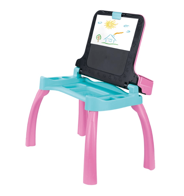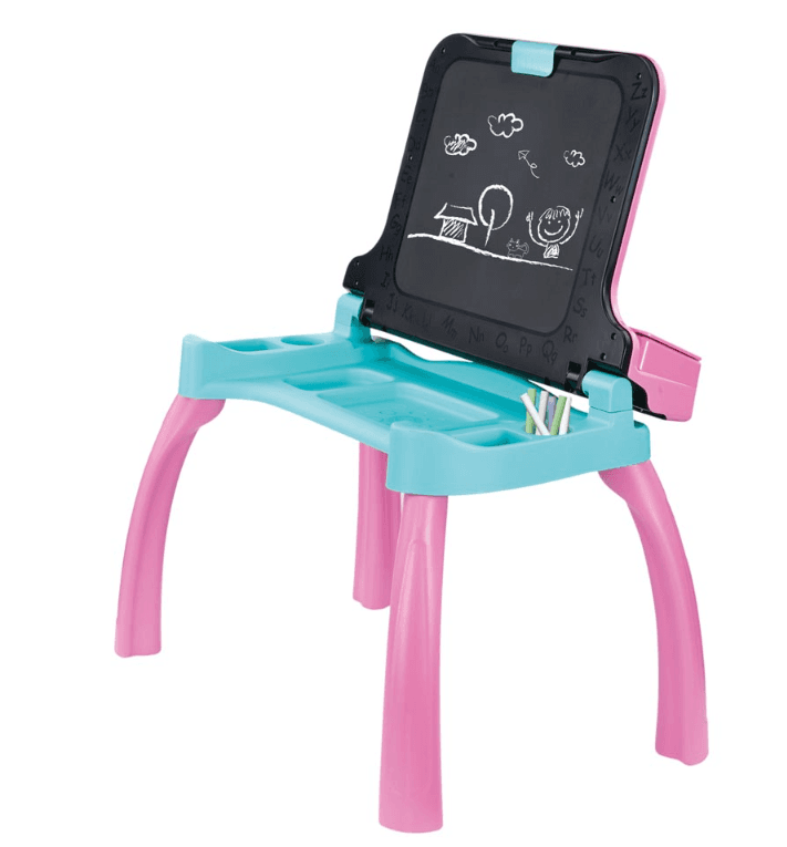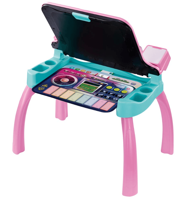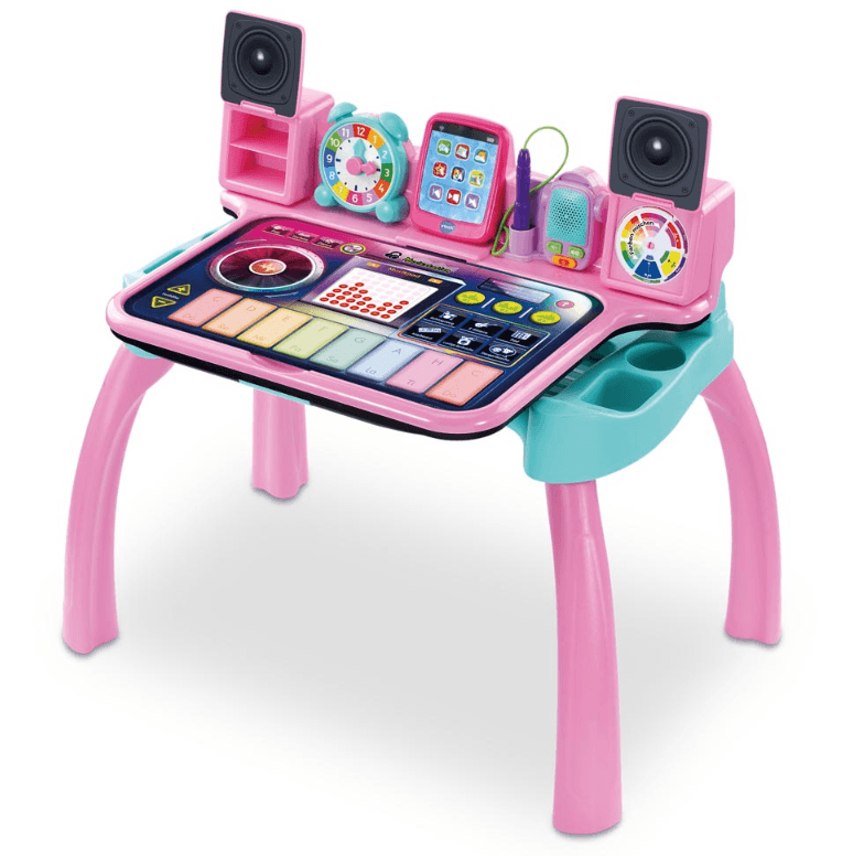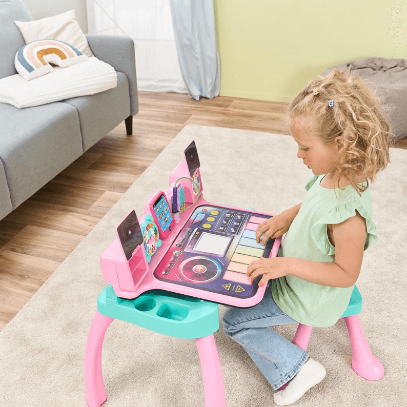 Zusätzlich enthält der Schreibtisch eine Lernuhr, ein DJ-Pult, ein Whiteboard, ein Bilderrahmen und seitliche Aufbewahrungsfächer für Stifte und Zubehör. Der mitgelieferte Hocker sorgt für bequemes Sitzen beim Lernen und Spielen.