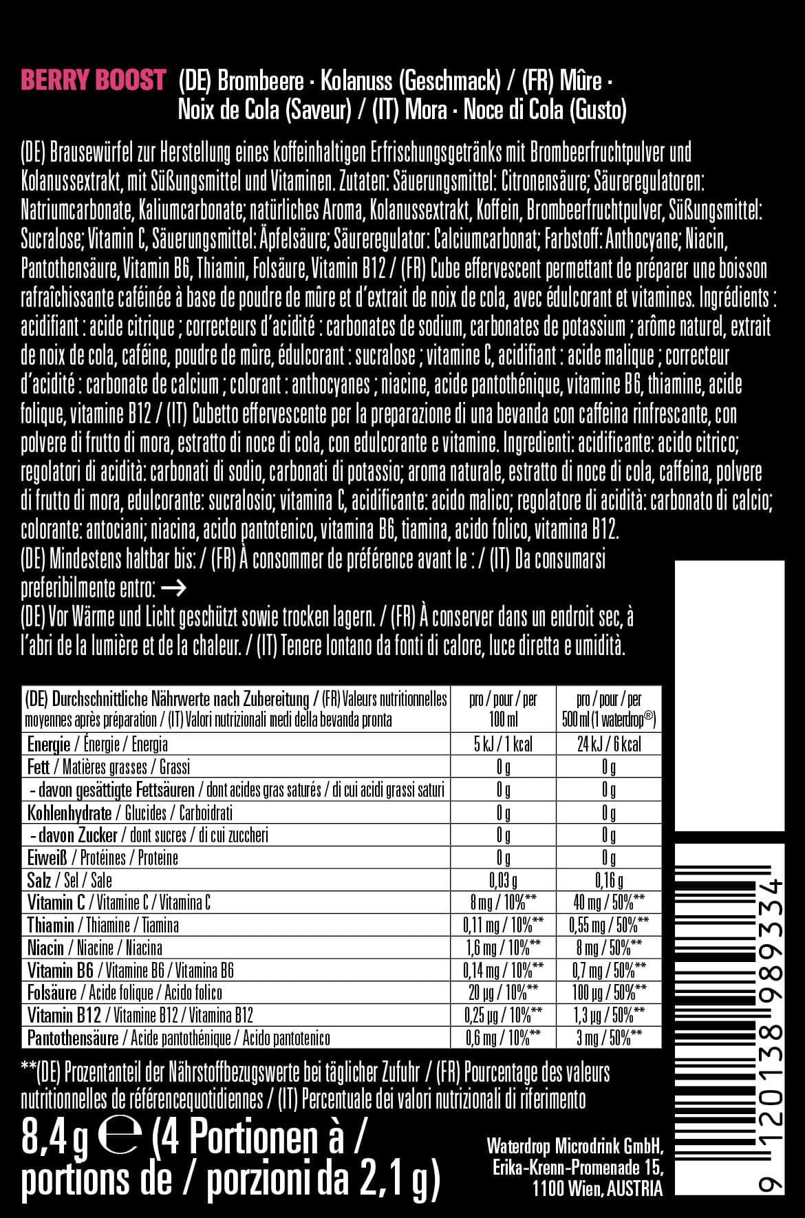 | Zutaten | Säuerungsmittel: Citronensäure; Säureregulatoren: Natriumcarbonate, Kaliumcarbonate; natürliches Aroma, Kolanussextrakt, Koffein, Brombeerfruchtpulver, Süßungsmittel: Sucralose; Vitamin C, Säuerungsmittel: Äpfelsäure; Säureregulator: Calciumcarbonat; Farbstoff: Anthocyane; Niacin, Pantothensäure, Vitamin B6, Thiamin, Folsäure, Vitamin B12 |