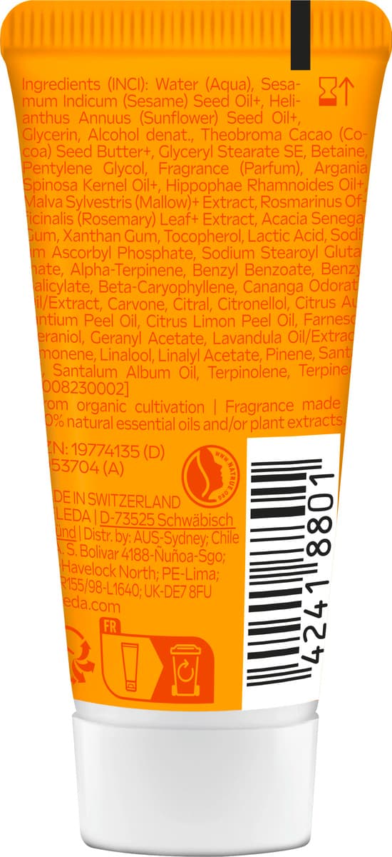InhaltsstoffeIngredients (INCI): Water (Aqua), Sesamum Indicum (Sesame) Seed Oil+, Helianthus Annuus (Sunflower) Seed Oil+, Glycerin, Alcohol denat., Theobroma Cacao (Cocoa) Seed Butter+, Glyceryl Stearate SE, Betaine, Pentylene Glycol, Fragrance (Parfum), Argania Spinosa Kernel Oil+, Hippophae Rhamnoides Oil+, Malva Sylvestris (Mallow)+ Extract, Rosmarinus Officinalis (Rosemary) Leaf+ Extract, Acacia Senegal Gum, Xanthan Gum, Tocopherol, Lactic Acid, Sodium Ascorbyl Phosphate, Sodium Stearoyl Glutamate, Alpha-Terpinene, Benzyl Benzoate, Benzyl Salicylate, Beta-Caryophyllene, Cananga Odorata Oil/Extract, Carvone, Citral, Citronellol, Citrus Aurantium Peel Oil, Citrus Limon Peel Oil, Farnesol, Geraniol, Geranyl Acetate, Lavandula Oil/Extract, Limonene, Linalool, Linalyl Acetate, Pinene, Santalol, Santalum Album Oil, Terpinolene, Terpineol. +from organic cultivation Fragrance made of 100% natural essential oils and/or plant extracts.