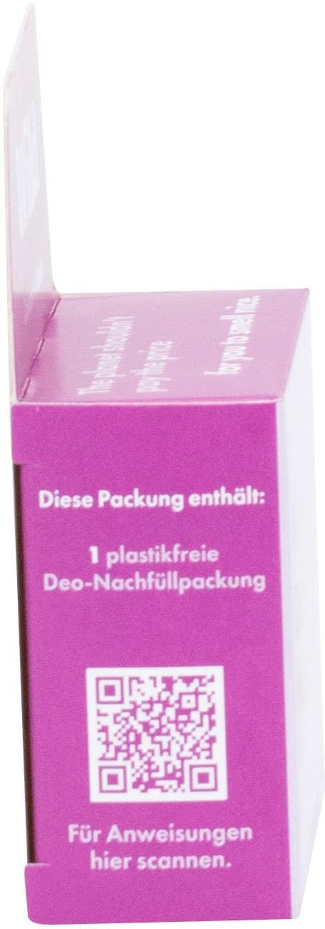 | Anwendungshinweis | Die Deocreme sparsam auf die sauberen und trockenen Achselhöhlen auftragen und kurz einziehen lassen. Bereit zum Nachfüllen: Drehe den unteren Teil des Deos nach links bis zum Anschlag. Drücke die Seitenknöpfe zusammen und ziehe den unteren Teil aus der Deohülle. |