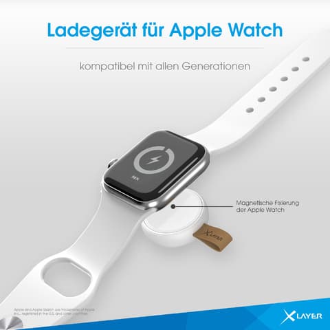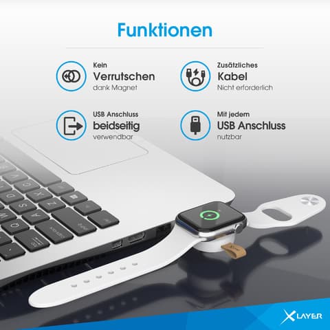 Mit dem Apple Watch-Ladegerät von XLayer können Sie Ihre Apple Watch jetzt im Handumdrehen aufladen. Die kompakte Ladestation passt in jede Tasche und verwandelt jeden USB-Anschluss mit einem Handgriff in einen kabellosen Ladespot für Ihre Apple Watch. Einfach den Adapter in einen passenden USB-Port stecken und die Apple Watch auflegen! Der Ladevorgang startet automatisch und dank der magnetischen Fixierung kann Ihre Apple-Watch nicht verrutschen.