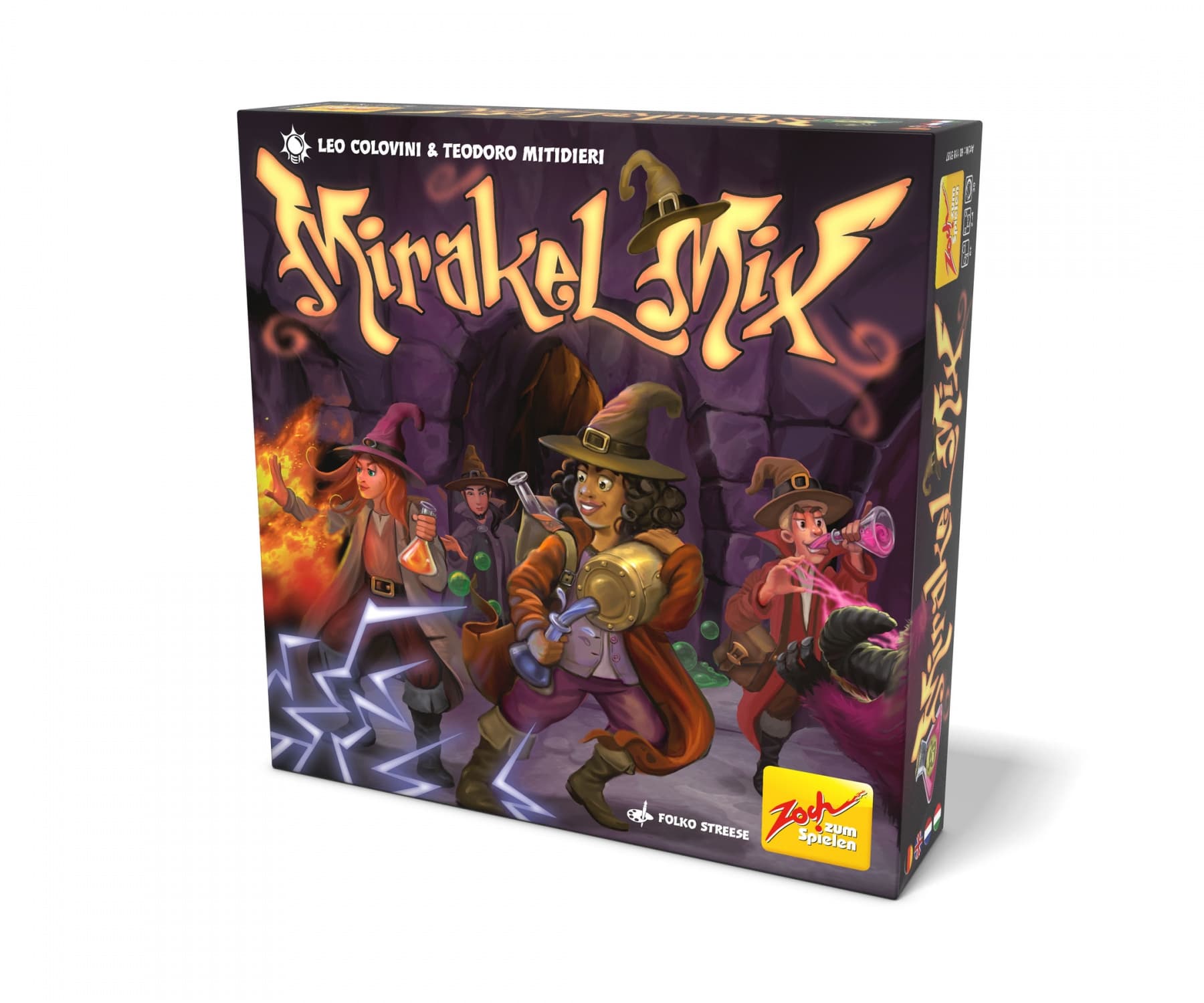 Da braut sich was zusammen im magischen Universum von„Mirakel Mix"! Mutige Zauberlehrlinge suchen den Weg aus einer Höhle mit mysteriösen Barrieren und verborgenen Geheimnissen. Nur wer sich als wahrer Meister der Zaubertränke erweist, findet die richtige Mischung und gelangt zurück ans ersehnte Tageslicht. Der Spielplan gleicht einem Labyrinth, in dem die kürzesten Wege durch Flammenwände, Blitzgitter und andere tückische Barrieren versperrt werden. Mit den passenden Zaubertränken lassen sie sich zwarüberwinden– doch zuerst muss die richtige Mixtur gefunden werden. Während die Spieler abwechselnd ihre magischen Mixturen kreieren, steigt die Spannung. Wer den entscheidenden letzten Tropfen zum Trank hinzufügt,überwindet das Hindernis. Gewonnen hat, wer sich am schnellsten seinen Weg aus der Höhle bahnt.„Mirakel Mix", geeignet für 2–4 Spieler ab 6 Jahren, ist ein Kinderspiel voller Magie und Abenteuer. Geschaffen von Leo Colovini und Teodoro Mitidieri und illustriert von Folko Streese bietet es ein zauberhaftes Spielerlebnis für die ganze Familie.